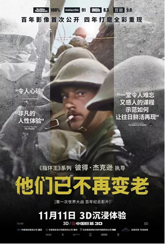 《他們已不再變老》是由華納兄弟影業(yè)出品,奧斯卡金像獎獲獎導演彼得·杰克遜(《指環(huán)王》三部曲,《霍比特人》三部曲)執(zhí)導的戰(zhàn)爭紀錄片。電影聚焦于1914年—1918年一戰(zhàn)士兵的日常生活。片中大部分史料均為首次公開,制作團隊應用最頂尖修復、上色及3D 技術,將百年前影像進行全彩修復并重新加入聲效,以英國老兵口述史為旁白還原一戰(zhàn)士兵遭遇和感受,為觀眾呈現(xiàn)身臨其境、極度真實的沉浸式戰(zhàn)爭體驗。